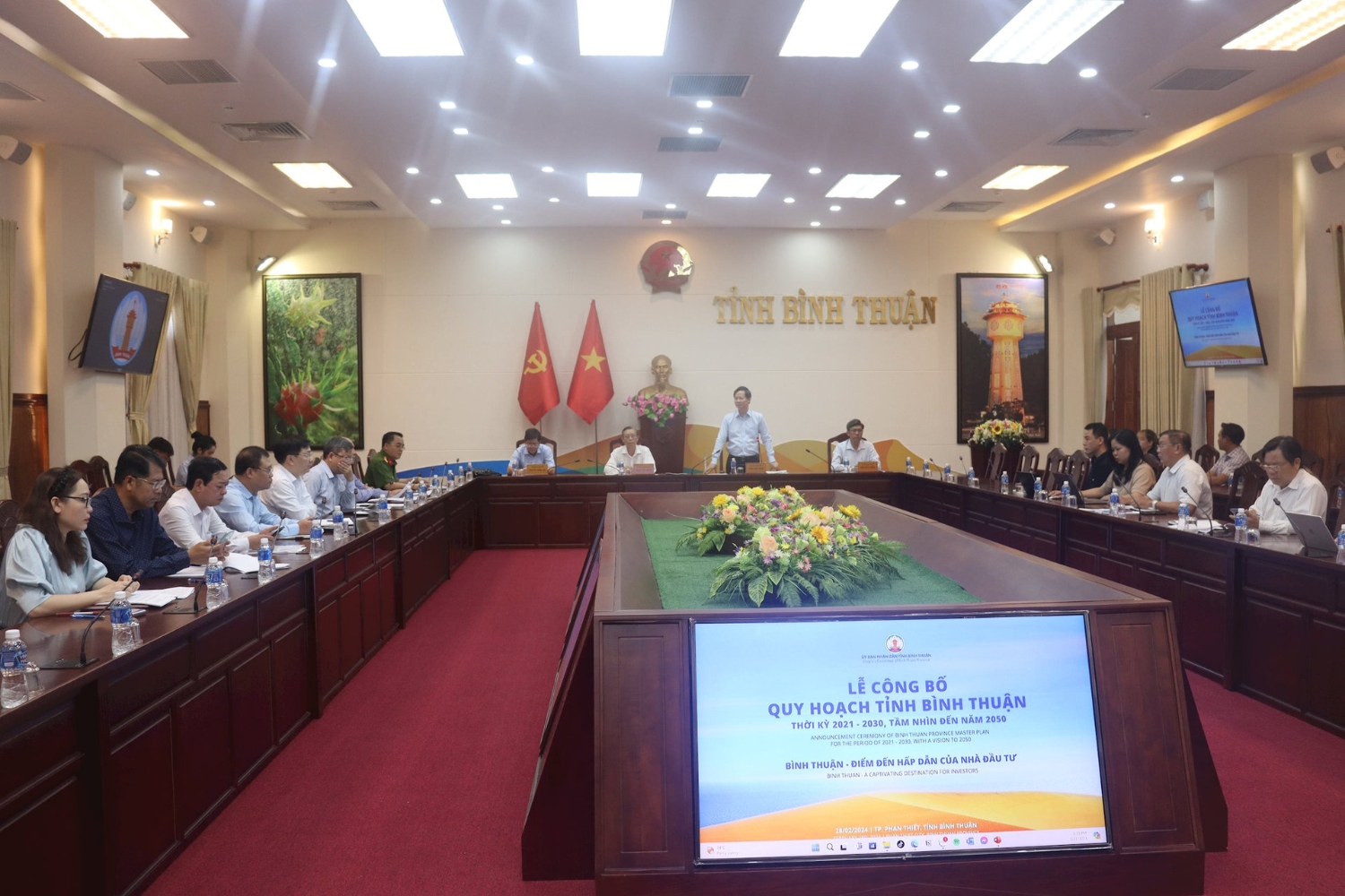 Cuộc họp đã nghe lãnh đạo Sở Kế hoạch và Đầu tư, đại diện đơn vị tư vấn tổ chức sự kiện báo cáo tiến độ triển khai thực hiện các nội dung liên quan đến Lễ Công bố Quy hoạch tỉnh Bình Thuận thời kỳ 2021 - 2030, tầm nhìn đến năm 2050 sẽ chính thức diễn ra vào ngày 28/2/2024 tại Sea Links City - TP. Phan Thiết.