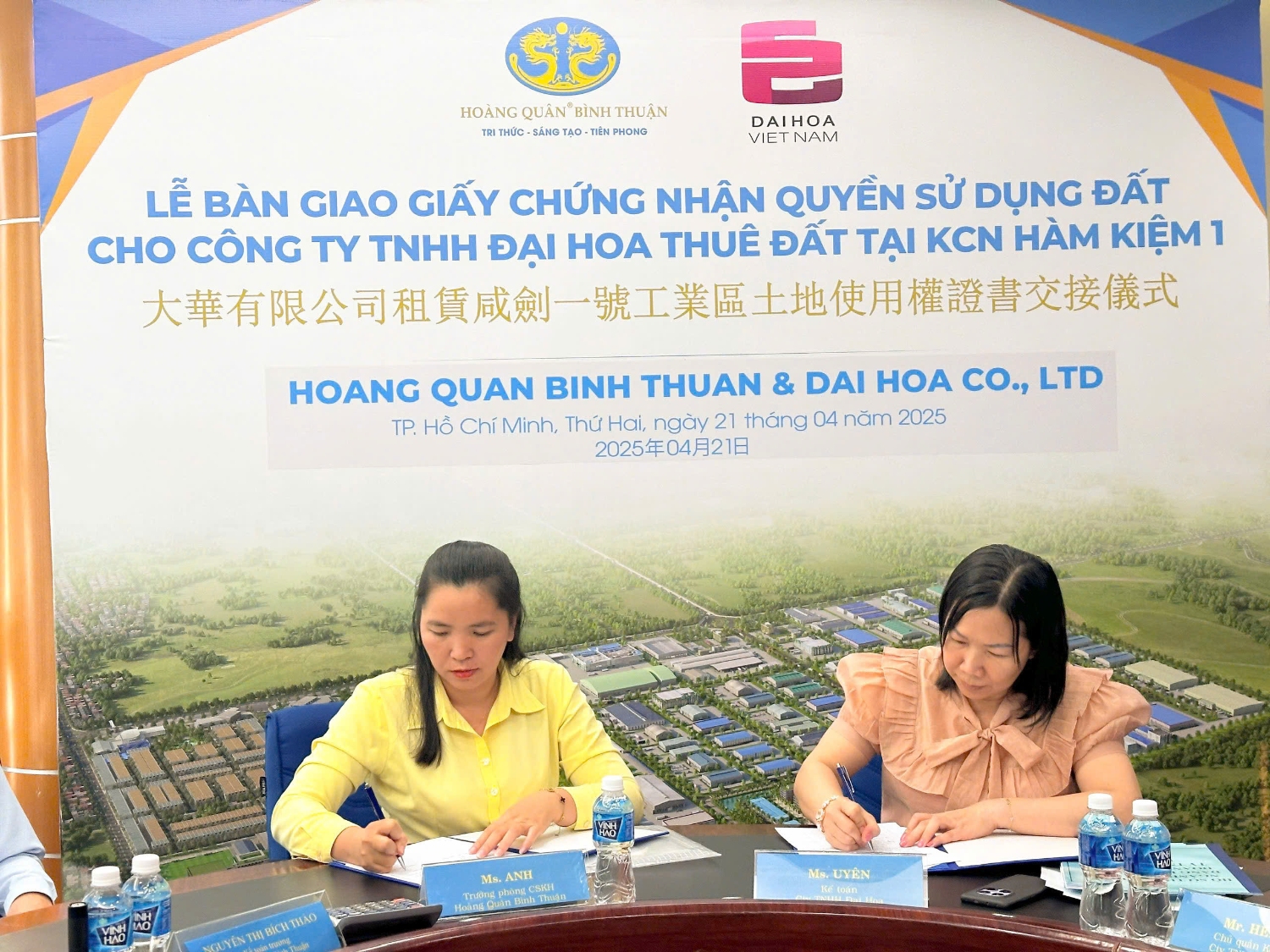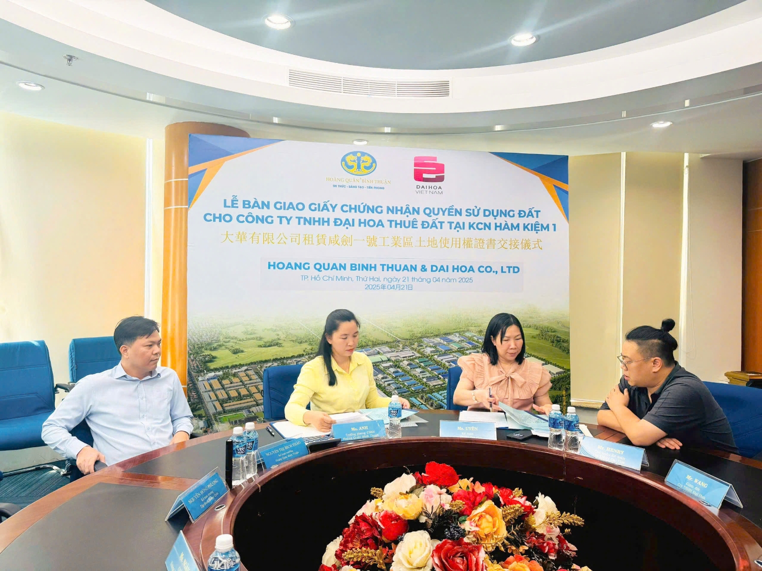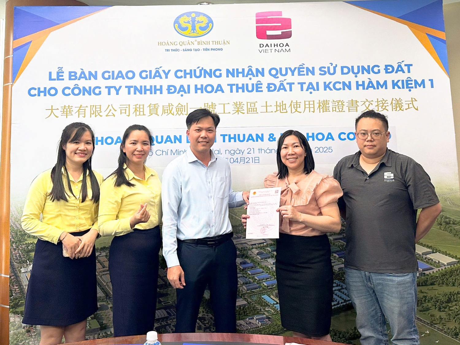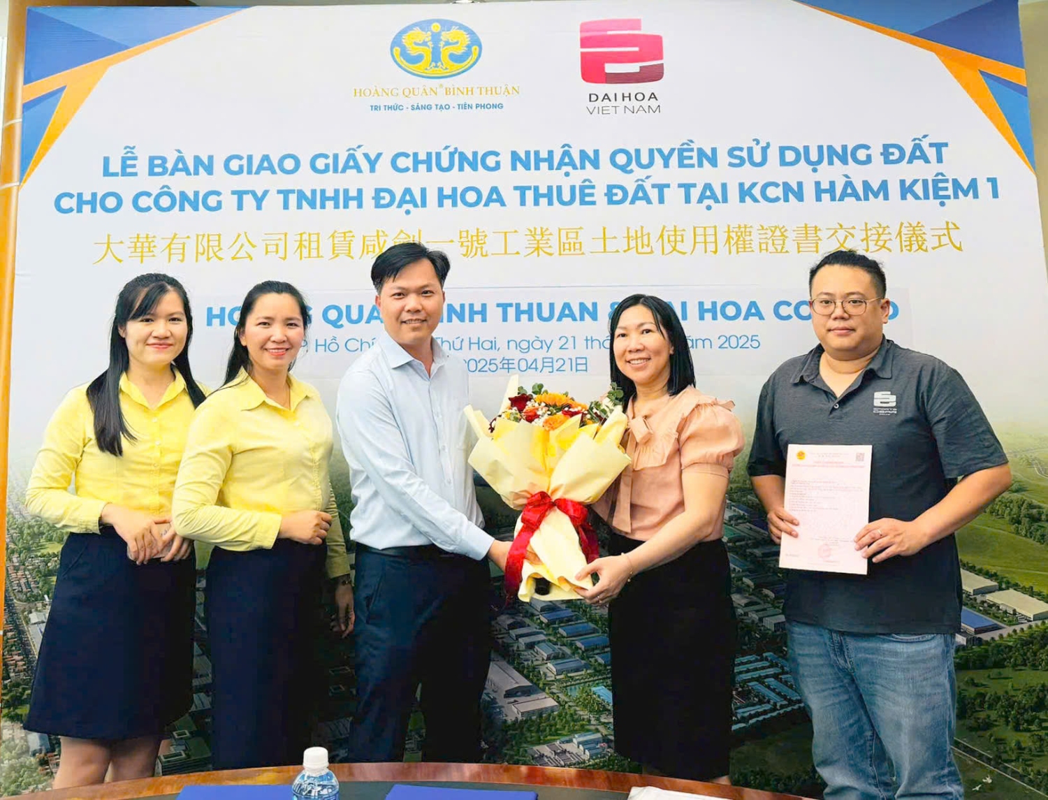 Lễ bàn giao Giấy chứng nhận quyền sử dụng đất là bước đi quan trọng tiếp nối thành công của lễ ký kết hợp đồng thuê đất tại KCN Hàm Kiệm 1 giữa Công ty Đại Hoa và Công ty Hoàng Quân Bình Thuận. Trong sự kiện này, đại diện Hoàng Quân Bình Thuận tiến hành bàn giao các giấy tờ pháp lý quan trọng cho Công ty TNHH Đại Hoa gồm: Giấy chứng nhận đăng ký hoạt động chi nhánh, Hồ sơ xin cấp chứng nhận đầu tư, hồ sơ xin cấp chứng nhận hoạt động kinh doanh tại chi nhánh…