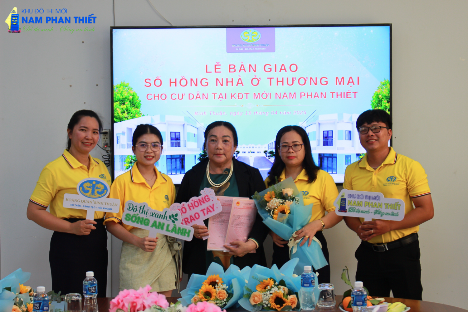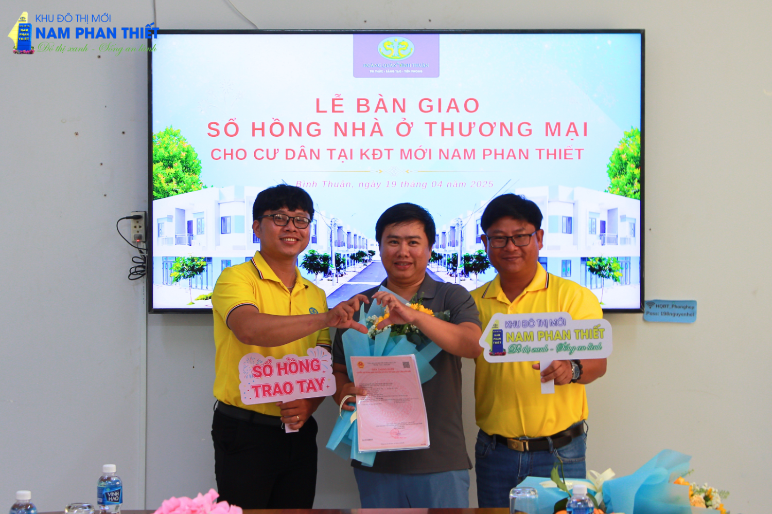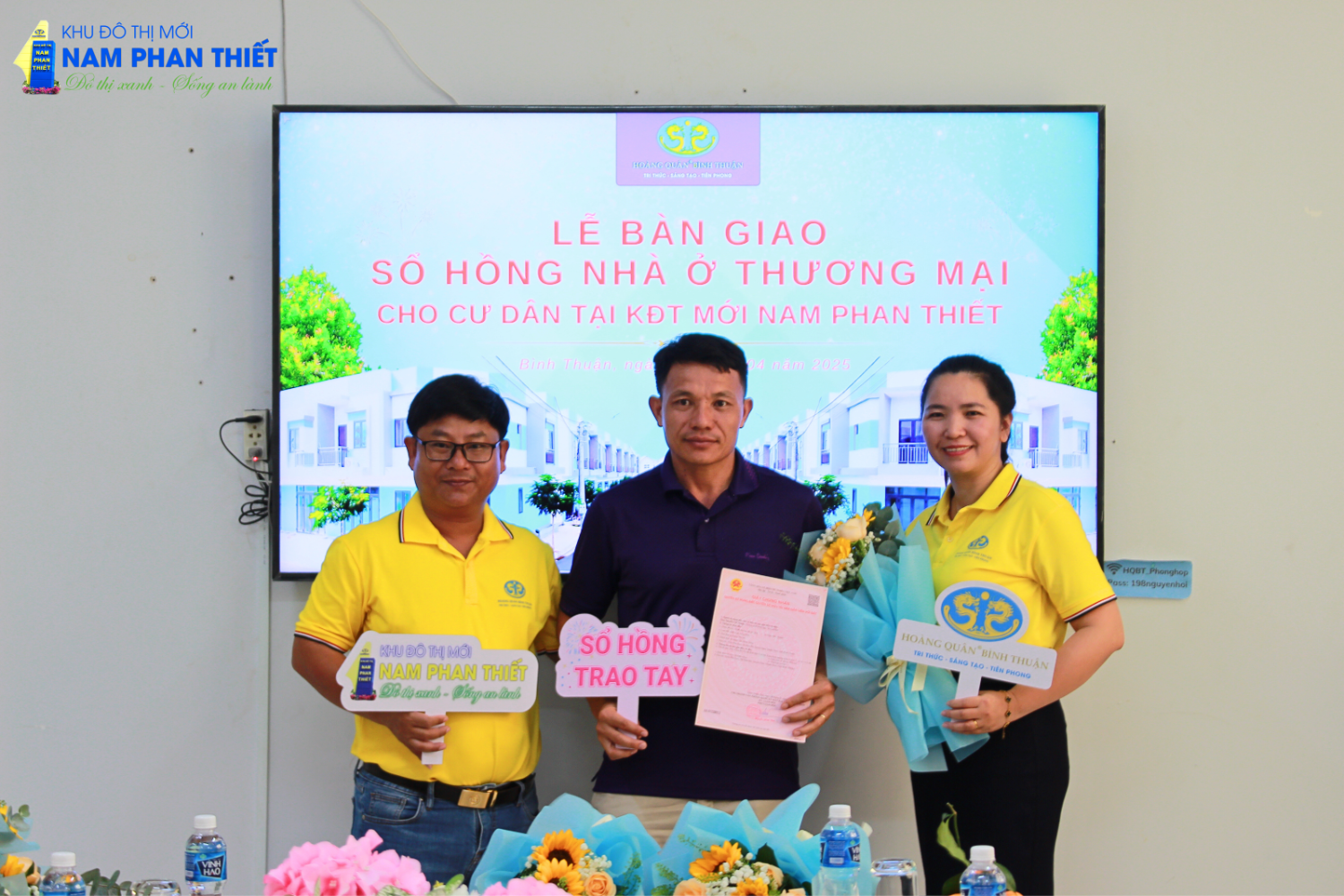 Sáng 19/4/2025, tại Công ty Cổ Phần TV – TM – DV Địa Ốc Hoàng Quân Bình Thuận đã diễn ra buổi lễ trao sổ hồng nhà ở thương mại đợt 2 cho cư dân tại dự án Nhà ở xã hội KCN Hàm Kiệm 1. Đây là một dấu mốc quan trọng, khẳng định cam kết của Hoàng Quân Bình Thuận trong việc mang đến những sản phẩm nhà ở chất lượng, đảm bảo pháp lý cho khách hàng.